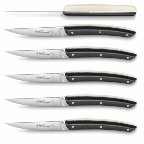 Plusieurs coloris sont disponibles pour ce couteau : noir et noir mat, noir et noir brillant, crème et noir, noir et crème, crème et rouge. Les deux parties de son manche peuvent être dépareillées pour encore plus d’originalité !