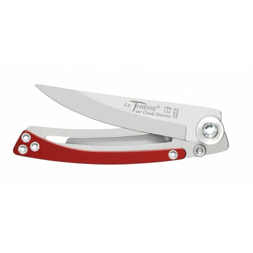 Son manche en bakélite est incrusté de cristaux Swarovski, tout comme l’axe du couteau. Il est disponible avec un manche noir, rouge ou gris selon vos envies.
