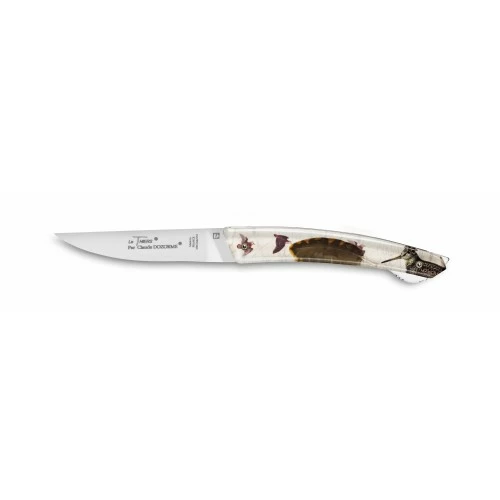 Son manche en Cristallium, un verre de synthèse qui ne ternit pas, est gravé de motifs comme la truite, le cerf, le sanglier ou la bécasse.